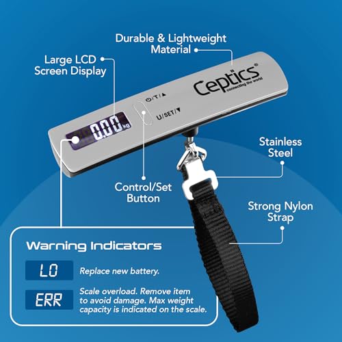 VERSATILE UTILITY: Ceptics luggage weighing scale serves multiple purposes, making it suitable for weighing suitcases, cabin bags, backpacks, and more