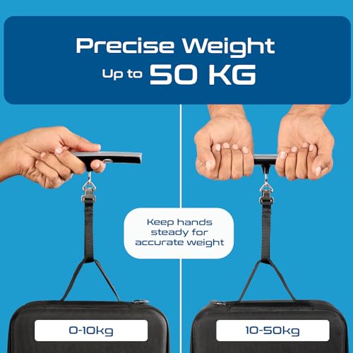 LUGGAGE CAPACITY: Our luggage weight machine capacity of 50 kg (110 lb) with a remarkable precision accuracy of 0.2 lb (0.1 kg). Dimensions: 13.3 x 3.2 x 5.0 cm – L x W x H (5.23 x 1.2 x 2 Inch). It comes equipped with a long-lasting CR2032 battery, ensuring reliability during your travels. For precise measurements, keep your hands steady and parallel to the ground, and if the weight exceeds 12 kgs, it is recommended to use both hands.