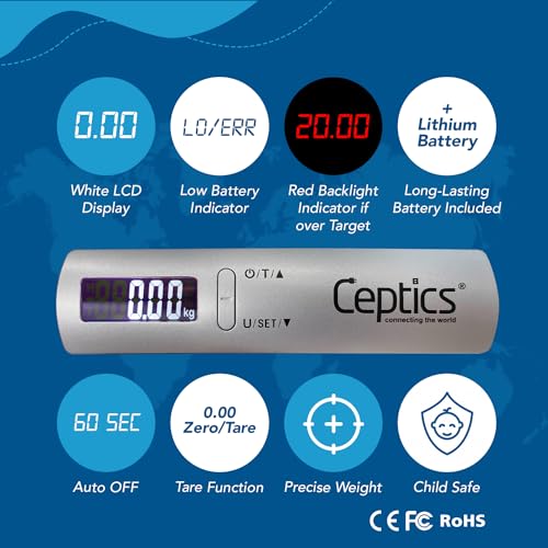 MULTIFUNCTION INDICATORS: Ceptics digital weight machines are designed for ease of use, featuring multifunction indicators such as automatic shutoff, display reading auto-locks for about 2 minutes before shutting off, a battery status indicator, and a reverse LCD (Red/White) display with night vision-friendly backlighting. Additionally, these luggage weight machines include a Tare function, ensuring convenient and precise measurement of your luggage’s net weight.