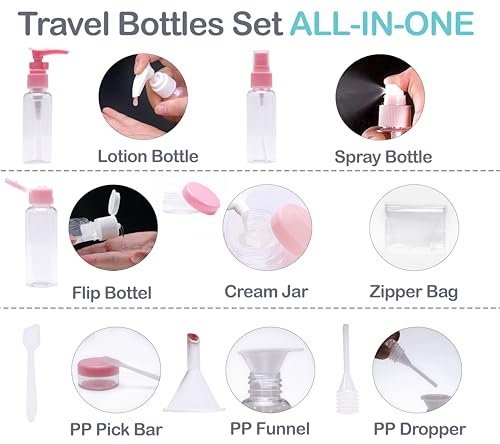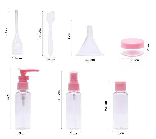 PACKAGE INCLUDE: 1 x pump bottle, 2 x spray bottles, 1 x plastic empty bottle, 2 x Cream jars, 1 x spoon, 1 x funnel, 1 x dropper, 1 x sticker label, and 1 x clear toiletry bag.