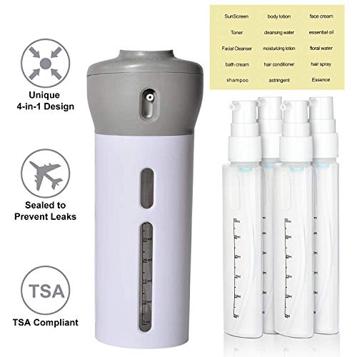4-In-1 Design: Unique 4-in-1 design features 4 refillable travel bottles in one durable dispenser case. Simply rotate the top to switch between different travel dispensers, and press to get instant access to shampoos, conditioners, lotions, body wash, serums, hand sanitizers with the 4 in 1 travel dispenser bottles.