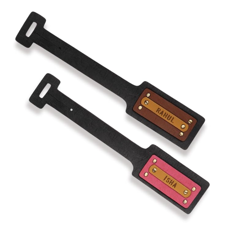The Junket Personalized Luggage Tags for Men and Women (Pack of 2) | Leather Travel Tags with Customized Name | Handcrafted Customized Gifts for Couple with Adjustable Belt (Black with Tan)